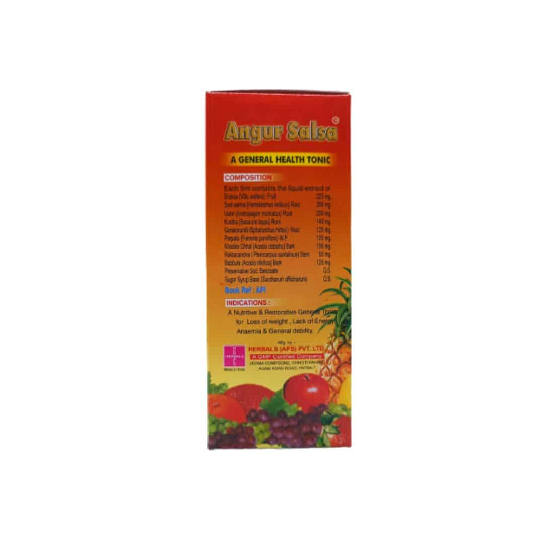 Angur Salsa  Tonic is enhances the general health of the body a nourishing and restorative general tonic complete Ayurvedic product that helps in nourishing our body. and , lack of energy, Weakness, Weight Loss, Insomnia, Loss Of Appetite, its helps.