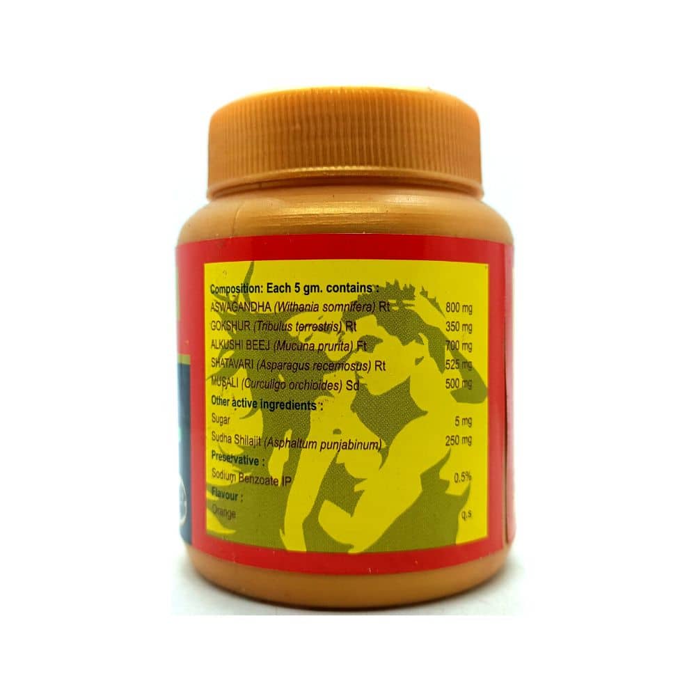 aswagandha ( withania somnifera) rt 800 mg, gokshur ( tribulus terrestris) at 350 mg, alkushi beej ( mucuna prurita) ft 700 mg, shatavari ( asparagus recemosus) at 525 mg, musali ( curculigo orchioides) sd 500 mg’