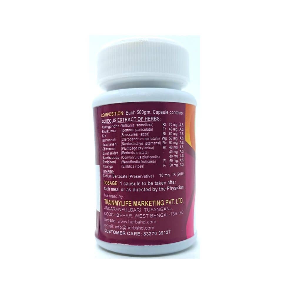 Dalchini (Cinnamomum zeylanicum) 50 mg, Mandoor Bhasma (Classical preparation) 5 mg, Safed Musli (Asparagus adscendens) 50 mg, Bringiraj (Phyllanthus Urinaria) 25 mg, Guduchi satv (Tinospora cordifolia) 25 mg, jatiphal (Myristica fragrans) 25 mg, Ashwagandha (Withania somnifera) 50 mg, Vishtundakadi vati (Clasical Prepration) 20 mg, Shudh Shilajit (Asphaltum punjabianum) 55 mg, Triphala (Clasical Prepration) 75 mg, Vidhara (Argyreia nervosa) 25 mg, Akarkara (Anacyclus pyrethrum) 20 mg, Vang Bhasm 20 mg.