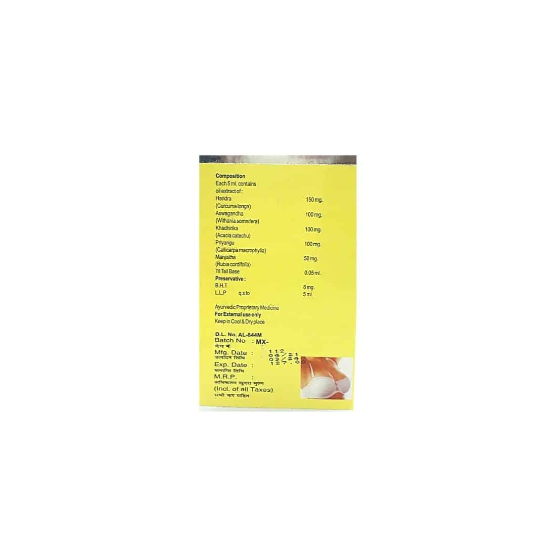 Haridra (Curcuma longa) 150 mg, Aswagandha (Withania Somnifera) 100 mg, Khadhirika (Acacia catechu) 100 mg, Priyangu (Callicarpa macrophylla) 100 mg, Manjishta (Rubia Cordifolia) 50 mg, Til Tail Base 0.05 ml,