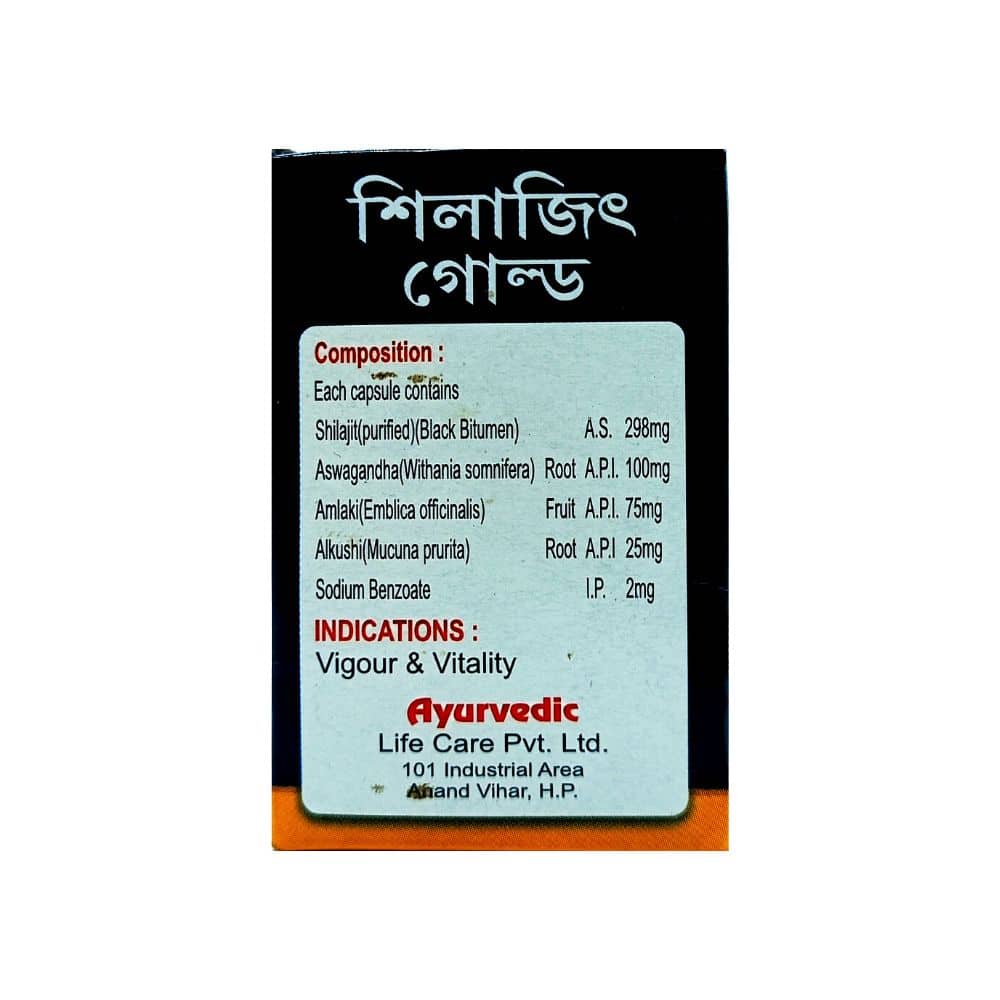 Shilajit 298 mg, Aswagandha 100 mg, Amlaki 75 mg, Alkushi 25 mg, Sodium Benzoate 2 mg.