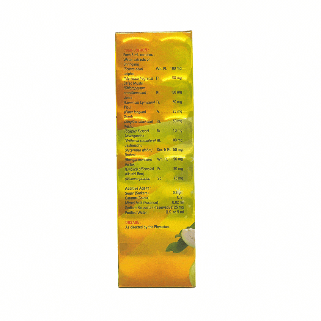 Each 5 ml Contains: Water Extracts of: Bhringaraj 100 mg, Jaiphal 50 mg, Safed mushli 50 mg, Jeera 50 mg, Pipul 25 mg, Sunth 50 mg, Keshu 10 mg, Aswagandha 100 mg, Jastimadhu 50 mg, Brahmi 50 mg, Amlaki 50 mg, Alkushi beej 75 mg.