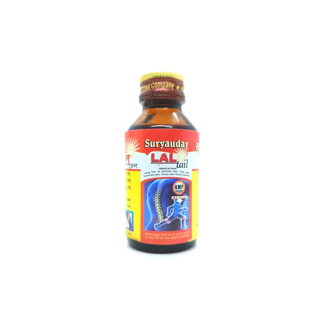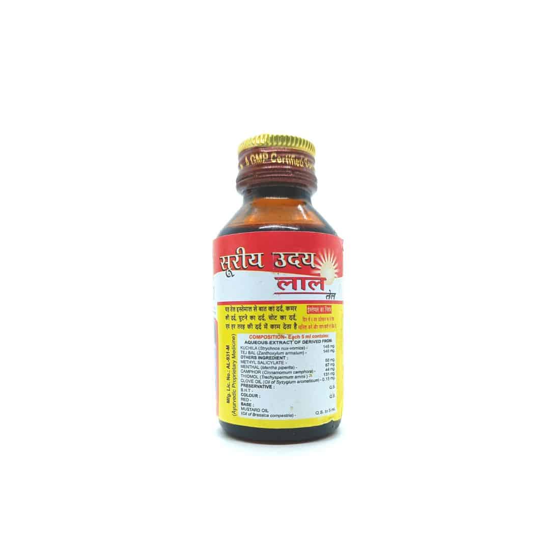 Suryauday Lal Tail use of this oil is beneficial in Rheumatism, joint pain, sprains, bruises and any other ailments.