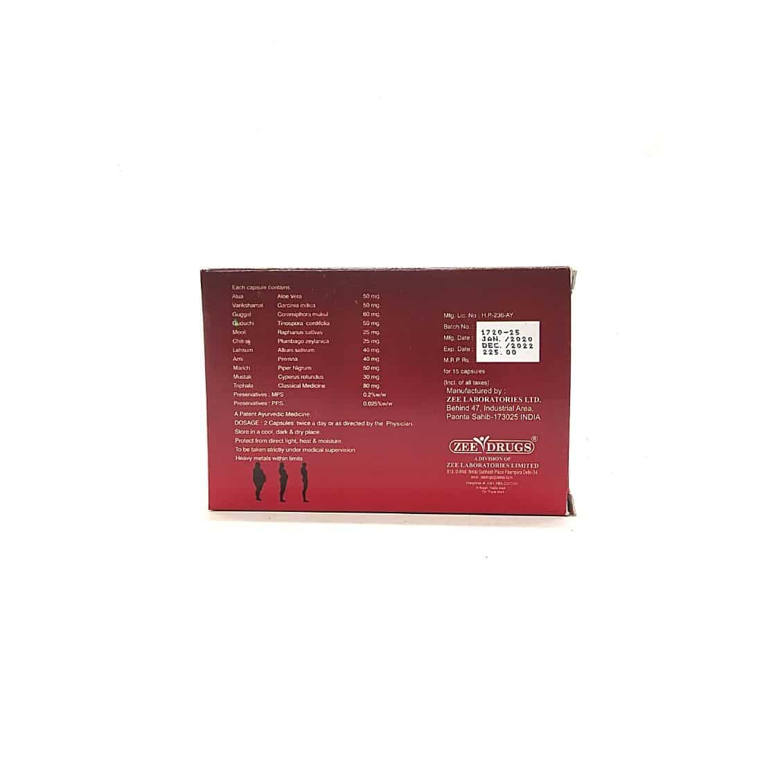 ALUAÂ (ALOE VERA)Â Â 50 MG, VARIKSHAMAL ( GARCINIA INDICA)Â Â 50 MG, GUGGALÂ Â (COMMIPHORA MUKUL)Â Â 60 MG, GUDUCHIÂ Â (TINOSPORA CORDIFOLIA)Â Â 50 MG, MOOLIÂ Â ( RAPHANUS SATIVAS)Â Â 25 MG, CHITRAKÂ (PLUMBAGO ZEYLANICA)Â 25 MG, LEHSUM (ALLIUM SATIVAM)Â Â 40 MG, ARNIÂ Â (PREMNA)Â Â 40 MG, MARICHÂ (PIPER NIGRUM)Â Â 50 MG, MUSTAKÂ (CYPERUS ROTUNDUS)Â Â 30 MG, TRIPHALAÂ Â (CLASSICAL MEDICINE)Â 80 MG.