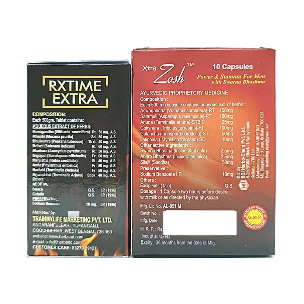 Ayurvedic Xtra Zosh Capsules & RxTime Extra Tablet are primarily used to treat erectile dysfunction (impotence) and premature ejaculation in men. Increases blood flow to the male genitals resulting in thicker, fuller and larger erections. It is an Ayurvedic medicine. It helps in increasing male vigor and performance, Stamina. This capsule improves overall body composition and well-being.